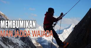 Dalam hidup harus rela untuk bersusah payah dahulu baru kemudian menikmati jerih payah kita. Man jadda wa jadda bukan hadist. Tulisan arab man jadda wa jadda man shabara zhafira. Menariknya, kesalahan kata kunci yang ramai orang cari di google bagi tulisan ini adalah man jadda wa jadda sedangkan yang sebetulnya adalah man jadda wajada. Tulisan man jadda wajada dan man jadda wajadda tentu memberikan arti yang berbeda, karena peletakan tasydid di situ.